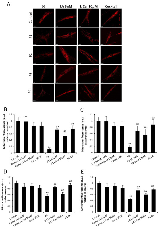 Effect of LA and LCAR on mitochondrial polarization and network in control and NM cells. Control (C1) and NM fibroblasts (P1, P2, P3, and P4) were treated (+) with 5 μM LA and 10 μM LCAR individually or in combination (Cocktail) for 7 days. (A) Representative images of untreated and treated control (C1) and NM fibroblasts (P1 and P2) stained with MitoTrackerTM Red CMXRos, an in vivo mitochondrial membrane-potential-dependent probe. Images were taken using a 40× lens and processed by ImageJ software. Scale bar = 20 µm. (B–E) Fluorescence quantification of MitoTracker signal. Data represent the mean ± SD of three separate experiments (at least 100 cells for each condition and experiment were analyzed). ** p < 0.01 between NM and controls cells; aa p < 0.01 between untreated (-) and treated NM cells. a.u.: arbitrary units.