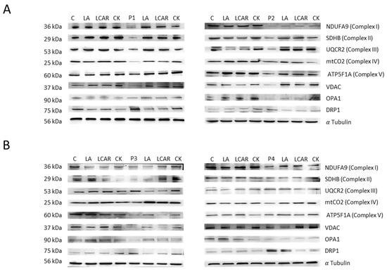 Effect of LA and LCAR on mitochondrial protein expression levels in control and NM cells. Control (C1) and NM fibroblasts (P1, P2, P3, and P4) were treated with 5 µM LA and 10 µM LCAR individually or in combination (Cocktail, CK) for 7 days. (A) Cellular extracts from control and NM patient cell lines P1 and P2 were subjected to immunoblotting analysis. (B) Cellular extracts from control and NM patient cell lines P3 and P4 were subjected to immunoblotting analysis. An SDS polyacrylamide gel was used to separate protein extracts (50 μg), then the samples were immunostained using antibodies against NDUFA9, SDHB, UQCR2, Mt-CO2, ATP5F1A, VDAC, OPA1, and DRP1. α-Tubulin was used as a loading control. (Densitometry of the Western blotting Supplementary Figures S8–S11).