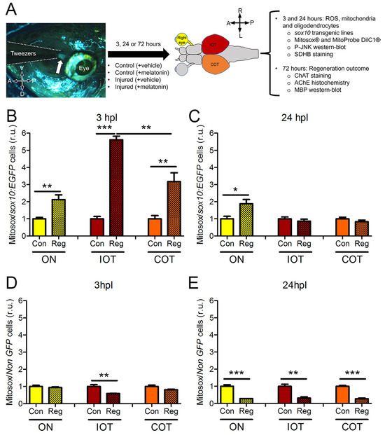 ROS measurement after ON crush. (A) Experimental design; the arrow points to the crushed ON from the ventral side. (B–E) Mitosox® fluorescence quantified by flow cytometry in sox10:EGFP cells at 3 hpl (B) and 24 hpl (C) or non-GFP cells at 3 hpl (D) and 24 hpl (E). Values are relative to control mean. A: anterior; Con: control; COT: contralateral optic tectum; D: dorsal; hpl: hours post-lesion; IOT: ipsilateral optic tectum; L: left; ON: optic nerve; P: posterior; R: right; Reg: regeneration; r.u.: random units; V: ventral. Student’s t-test between Reg and Con for each timepoint and region * p < 0.05; ** p < 0.01; *** p < 0.001. n = 4 for each group.