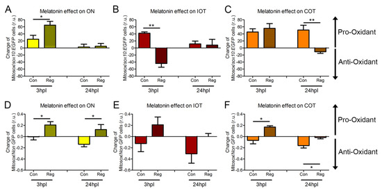 Melatonin impact on ROS production. (A–F) Mitosox® fluorescence quantified by flow cytometry in the sox10:EGFP cells of ON (A), IOT (B) and COT (C) and in the non-GFP cells of ON (D), IOT (E) and COT (F) at 3 and 24 hpl. The value shown in the graph is the result of the ROS measurement in each animal treated with melatonin minus the average ROS value in animals treated with vehicle in each respective group. Con: control; COT: contralateral optic tectum; hpl: hours post-lesion; IOT: ipsilateral optic tectum; Mel: melatonin; ON: optic nerve; Reg: regeneration; r.u.: random units. For (A–F), Student’s t-test was performed between Reg and Con for each timepoint and region. * p < 0.05; ** p < 0.01. n = 4 for each group in all experiments.