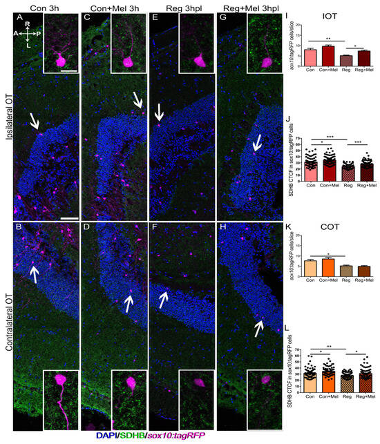 Analysis of oligodendrocyte and the mitochondrial distribution at 3 hpl. Immunostaining for SDHB (green) in a transgenic line carrying sox10:tagRFP reporter (magenta). Nuclei are counterstained with DAPI (blue). (A–H) Control IOT (A), control COT (B), control exposed to melatonin IOT (C), control exposed to melatonin COT (D), regenerating fish IOT (E), regenerating fish COT (F), regenerating fish exposed to melatonin IOT (G), regenerating fish exposed to melatonin COT (H). (I–L) Quantification of the number of oligodendrocytes per section in the IOT (I) and the COT (K); CTCF value of SHDB in oligodendrocytes in the IOT (J) and the COT (L). A: anterior; Con: control; COT: contralateral optic tectum; h: hours; hpl: hours post-lesion; IOT: ipsilateral optic tectum; L: left; Mel: melatonin; P: posterior; R: right; Reg: regeneration; r.u.: random units. ANOVA with Tukey’s Multiple Comparison Test * p < 0.05; ** p < 0.01; *** p < 0.001. Scale bar: 100 mm; 10 mm in inset. n = 4 for each group.