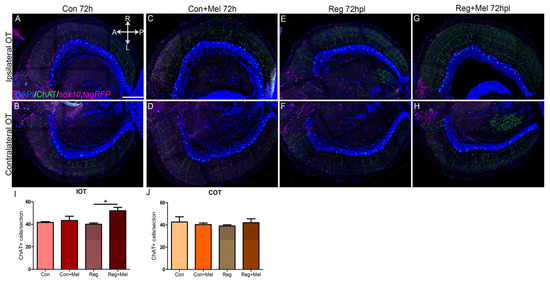 Quantification of ChAT neurons during regeneration at 72 hpl. (A–H) Immunohistochemistry against ChAT in the OT at 72 hpl in control (A,B), control exposed to melatonin (C,D), injured (E,F) and injured treated with melatonin (G,H). (I,J) Quantification of ChAT neurons per section of IOT (I) and COT (J). A: anterior; ChAT: choline acetyltransferase; Con: control; COT: contralateral optic tectum; h: hours; hpl: hours post-lesion; IOT: ipsilateral optic tectum; L: left; Mel: melatonin; P: posterior; R: right; Reg: regeneration; r.u.: random units. ANOVA with Tukey’s Multiple Comparison Test * p < 0.05. Scale bar: 200 mm. n = 4 for each group.