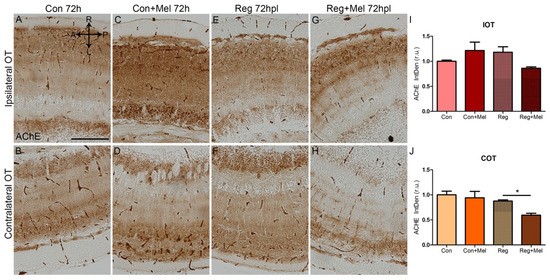 Quantification of AChE during regeneration at 72 hpl. (A–H) Histochemistry for AChE in the OT at 72 hpl in control (A,B), control exposed to melatonin (C,D), injured (E,F) and injured treated with melatonin (G,H). (I,J) Quantification of AChE staining in the IOT (I) and COT (J). A: anterior; AChE: acetylcholine esterase; Con: control; COT: contralateral optic tectum; h: hours; hpl: hours post-lesion; IOT: ipsilateral optic tectum; L: left; Mel: melatonin; P: posterior; R: right; Reg: regeneration; r.u.: random units. ANOVA with Tukey’s Multiple Comparison Test * p < 0.05. Scale bar: 200 mm. Scale bar: 200 mm. n = 4 for each group.