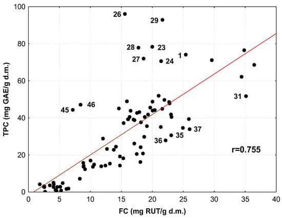 The relationship between TPC and FC in the medicinal herbs and spices is shown in Figure 1. An analysis of this plot and the value of the correlation coefficient (r = 0.755, p < 0.001) exhibit a strong relationship between TPC and FC values. Only a dozen samples clearly deviate from this relationship. For example, these are oregano herbs (sample 1, according to the numbering of samples in the first column of Table 1 and Table 3); leaves of lemon balm (23, 24, 26–29), peppermint (31, 35) and sage (36, 37); and hyssop spices (45, 46). Based on the data listed in Table 3, it can be assumed that those of the aforementioned samples located in Figure 1 above the regression line (1, 23, 24, 26–29, 45, 46) have relatively low FC values in relation to the phenolic compound content (TPC) of the medicinal herbs and spices. In contrast, the samples in Figure 1 below the regression line (31, 35, 36, 37) contain significantly more flavonoids than the other samples containing similar amounts of phenolic compounds (TPCs).