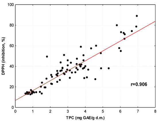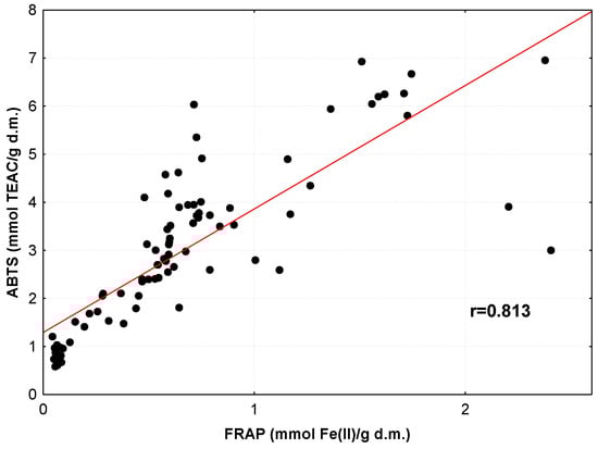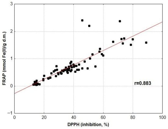 Because the antioxidant activity of medicinal herbs and spices was explored using three different assays (DPPH, ABTS and FRAP), we decided to examine the relationship between the results generated by these assays. This is graphically illustrated in Figure 2, Figure 3 and Figure 4. Analyses of these plots and the values of the correlation coefficients indicate the strong ability of plant antioxidants to both inhibit the activity of DPPH and ABTS radicals and to reduce Fe(III) ions. Similar relationships between TACDPPH and TACFRAP values were detected for yellow soybean infusions (r = 0.822) [67], Serbian medicinal plants (r = 0.908) [52] and Indian medicinal plants (r = 0.881) [59]. High correlation coefficients between TACDPPH, TACABTS and TACFRAP values were also found for ethanol–water extracts of selected medicinal plants (r = 0.819–0.972) [60].