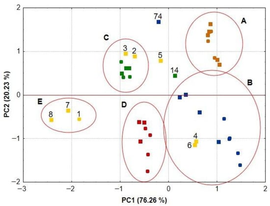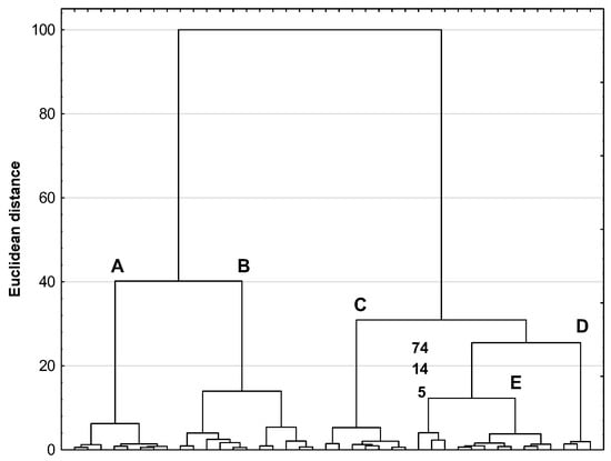 HCA, a second technique of multivariate analysis, was also used to interpret the experimental data obtained. HCA calculations boil down to determining the distance between objects or variables in a multidimensional space. On this basis, the study samples are grouped into specific clusters, with two samples being more dissimilar the greater the distance between them. Graphically presented in Figure 7, the results of the HCA calculation show that the medicinal herbs and spices examined form five clusters, A, B, C, D, and E, with identical composition (medicinal herbs and spices) as in the PCA calculation. In addition, also in this case, three spices, 5, 14 and 74, form a separate cluster. This indicates a very high correspondence between the PCA and HCA results, which confirm some differences in the phenolic profiles and antioxidant properties of the five medicinal plant species studied. This is reflected in the five distinct clusters in the PCA and HCA plots.