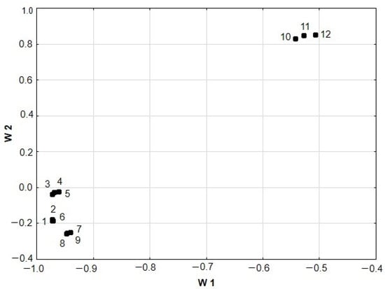 Two-dimensional loading plot of W1 and W2 calculated for the medicinal herbs and spices originating from the same species of medicinal plants. Variables: 1—TPC min, 2—TPC max, 3—FC min, 4—FC max, 5—DPPH min, 6—DPPH max, 7—ABTS min, 8—ABTS max, 9—FRAP min, 10—FRAP max, 11—FIC min, and 12—FIC max.