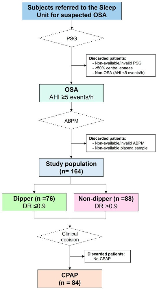 Flowchart of the study. Consecutive participants with suspected OSA who fulfilled the inclusion and exclusion criteria were subjected to in-laboratory PSG. Following ABPM, the patients were classified into two groups: dippers (DR ≤ 0.9) and non-dippers (DR > 0.9). Treatment recommendations for patients diagnosed with OSA were based on usual clinical practice, and patients treated with CPAP were evaluated after 6 months of follow-up. Abbreviations: ABPM: ambulatory blood pressure monitoring; AHI: apnea–hypopnea index; CPAP: continuous positive airway pressure; DR: dipping ratio; OSA: obstructive sleep apnea; PSG: polysomnography.