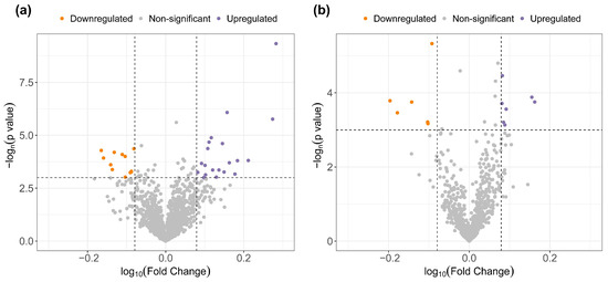 Untargeted plasma metabolomic (a) and lipidomic (b) profiling analysis. Volcano plots of the FC (x-axis) and p value (y-axis) for each detected metabolite and lipid in the comparison of non-dippers vs. dippers. Purple dots represent significantly downregulated (FC < 0.83) molecules, and orange dots represent significantly upregulated (FC > 1.25) molecules in non-dipper patients. The results are adjusted for confounding factors (age, sex, BMI, and antihypertensive medications). The threshold used to define statistical significance was p value < 0.05. Abbreviations: BMI: body mass index; FC: fold change.