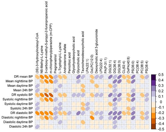 Adjusted linear associations between ABPM parameters and the identified metabolites and lipids. The color scale illustrates the degree of correlation and ranges from orange to purple, indicating negative to positive correlations, respectively. The results are adjusted for confounding factors (age, sex, BMI, and antihypertensive medications). Abbreviations: ABPM: ambulatory blood pressure monitoring; BP: blood pressure; CL: cardiolipin; DG: diacylglycerol; DR: dipping ratio; PG: phosphatidylglycerol; PA: phosphatidic acid; PC: phosphatidylcholine; PS: phosphatidylserine.