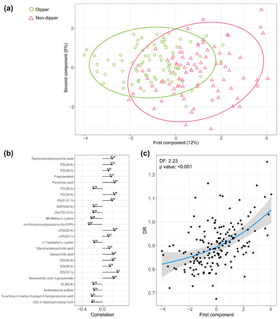A multivariate analysis based on PLS-DA was applied to the differentially detected metabolites and lipids. Figure 4a shows that the plasma metabolipidomic levels were able to separate patients with a dipping profile from those with a non-dipping profile, depicting a differential plasma metabotype associated with impaired BP dipping. Given that the first component of PLS-DA was the key contributor for separating the study groups (non-dippers vs. dippers), we performed an in-depth study on the loading of each feature to this component (Figure 4b). As illustrated in Figure 4c, the identified metabotype was significantly associated with the DR as a continuous variable.