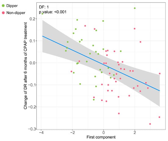 We next tested whether the baseline metabolipidomic signature of impaired BP dipping was able to explain the modulation in the DR after 6 months of OSA treatment with CPAP. As displayed in Figure 5, the molecular profile identified at baseline was linearly associated with changes in the DR after CPAP use (Figure 5). Higher loadings of the first component were associated with a post-treatment decrease in the DR (mainly representing non-dipper patients), whereas lower loadings of the first component at baseline were related to an increase in the DR after CPAP treatment (primarily representing non-dipper patients).