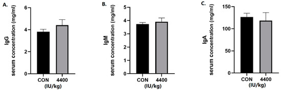We further tested the serum for immunoglobulins. The concentration of IgG (Figure 2A), IgM (Figure 2B), and IgA (Figure 2C) in serum was not significantly affected by VA in the 4400 IU/kg group compared with the control group.