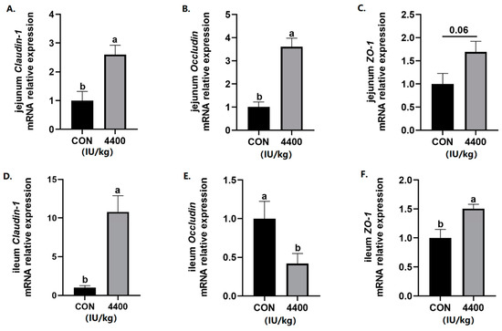 Since intestinal integrity is closely related to the diarrhea rate, intestinal tight junction protein gene expression was further detected. The data showed that compared with the control group, the expression of Claudin-1 and Occludin was significantly improved in the jejunum (p < 0.05), and ZO-1 expression had a trend to increase (p < 0.1) after vitamin A supplementation (Figure 3A–C). In the ileum, both Claudin-1 and ZO-1 expression was higher than the control group (p < 0.05), while the expression of Occludin was significantly decreased in the 4400 IU/kg group (p < 0.05, Figure 3D–F).