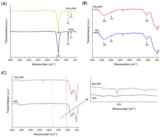 FTIR spectra in nanoparticles of (A) CaCO3, (B) TiO2, and (C) Al2O3.