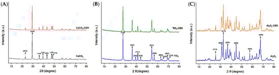 XRD in nanoparticles of (A) CaCO3, (B) TiO2, and (C) Al2O3.