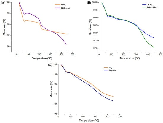 TGA in nanoparticles of (A) Al2O3, (B) CaCO3, and (C) TiO2.