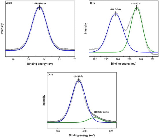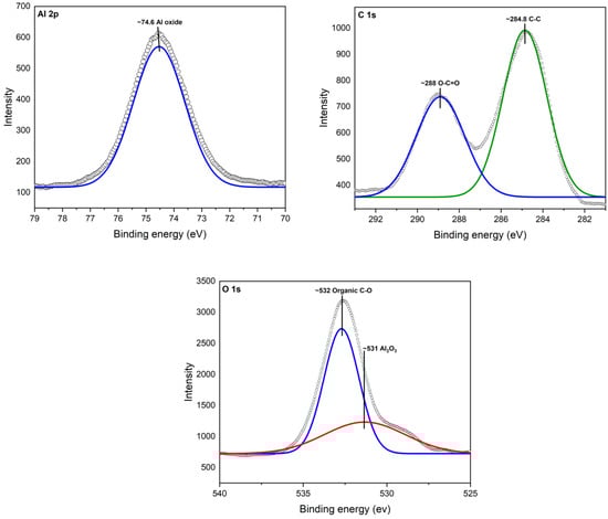 In Figure 5, the XPS spectra of Al2O3 after modification with CEO are illustrated. Notably, a new peak appeared for O 1s at ~532, corresponding to the chemical species of organic C-O. This observation confirms the presence of CEO on the Al2O3 surface, where it is now chemically bonded, primarily due to interactions with oxygen atoms. It is worth mentioning that the observed peaks were compared with Thermo Scientific’s Advantage data system for XPS [39].