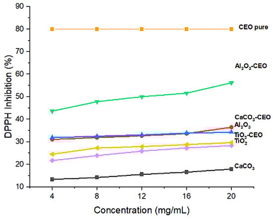 Essential oils can inhibit free radicals, which is a characteristic of great interest to our research. In this context, pure nanoparticles and nanoparticles loaded with CEO were evaluated for their antioxidant activity to determine if this property could be transferred to the metal oxide nanoparticles. Figure 6 shows the results of the inhibition degree of these nanoparticles. Among them, Al2O3 loaded with CEO exhibited a high inhibition value of 55%, followed by CaCO3 with CEO at 35% and TiO2 with CEO at 28%. Pure CEO demonstrates an 80% inhibition of the DPPH radical [40], indicating that approximately 30% of this inhibition is captured by the Al2O3 nanoparticles due to a strong interaction between them. In contrast, the pure nanoparticles exhibited low inhibition percentages, suggesting that this evaluated property can be transferred to the nanoparticles with a higher concentration, resulting in a better inhibitory effect. There is limited research on the interaction of metal oxide nanoparticles with cinnamon essential oil, restricting our ability to make direct comparisons with other research works. However, some researchers have reported the antioxidant activity of cinnamon essential oil (CEO). For instance, Liu et al. [41] described a lower percentage of inhibition than that obtained in the present work at a concentration of 10 mg/mL, with a value of 40%, while achieving a value of 82% inhibition at a higher concentration of 80 mg/mL. Similarly, in the research of Chen et al. [42], values comparable to those obtained for CEO were registered. At concentrations below 10 mg/mL, they maintained between 85–90% inhibition, reaching 100% inhibition at a concentration of 20 mg/mL. Also, this research mentioned that the antioxidant activity of CEO is similar to that of clove essential oil and lower than that of thyme, mint, and lavender essential oils.