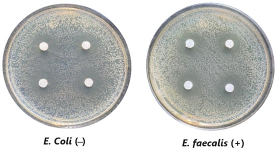 The microdilution and drop count methods were employed to assess the microbiological inhibition of nanoparticles loaded with cinnamon essential oil (CEO) and those without it. A disk diffusion test was initially conducted for pure CEO. In Figure 7, a clear inhibition zone of 12 mm (0.6 cm ratio) against both used bacteria (Escherichia coli and Enterococcus faecalis) demonstrates its antimicrobial effect. Kaskatepe et al. [43] determined the inhibition halo for cinnamon essential oil, reporting a high inhibition value for E. faecalis at 28 mm and for E. coli at 33 mm. These values are considerably higher than those obtained in our study. They suggest that the inhibitory effect could be correlated with the percentage content of cinnamaldehyde. Similarly, Atki et al. [44] investigated the antimicrobial activity of cinnamon essential oil using the Disc Diffusion Assay, where they obtained a notable value in the inhibition zone, reaching 29 mm for E. coli. On the other hand, Parisa et al. [45] observed a lower inhibition halo for cinnamon essential oil compared to our research with a measurement of 9.63 mm at a concentration of 40% for E. coli.