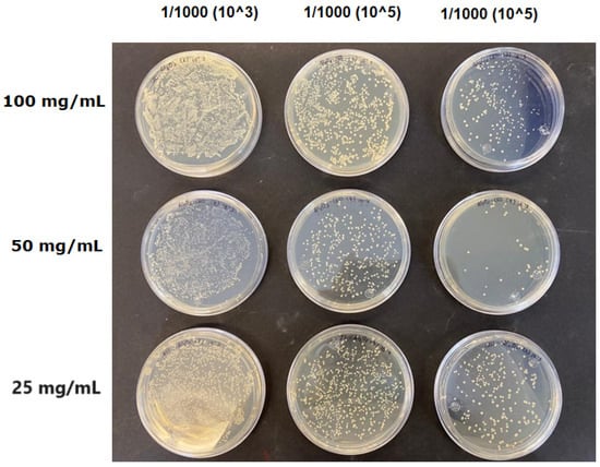 The CLSI standardized method involving microdilution and drop counting was employed to assess the antimicrobial activity of the nanoparticles. Escherichia coli (ATCC 25922) and Enterococcus faecalis (ATCC 29212) were selected as target bacteria for the analysis. These bacteria were cultured on soy agar medium and identified using the Gram stain method. The chosen CLSI method provides a reliable and recognized approach for evaluating the antimicrobial properties of substances against specific bacterial strains. A 200 mg/mL stock solution was serially diluted to 100, 50, and 25 mg/mL. Muller Hilton broth and ultrapure water were utilized for preparing the microdilutions. Inoculated microplates were incubated at 34 °C and 90 rpm for 24 h. Subsequently, 20 µL of each well was diluted five times in 180 µL of Muller Hilton broth. Finally, 10 µL of each dilution was plated on Trypticase Soy Agar to observe bacterial growth and potential inhibition by counting the number of colonies. The formula in Equation (2) was applied for a more precise result.