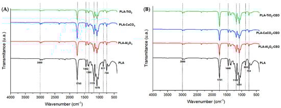 FTIR analysis of the films was conducted to examine the infrared spectrum of the polymer and any potential alterations or modifications when adding metal oxide nanoparticles and those modified with CEO. In Figure 9A, spectra of PLA with pure nanoparticles (i.e., unmodified) are presented. PLA exhibits the following bands: 3000 cm−1, corresponding to the stretching vibration mode of the CH3 unsaturated hydrocarbon bond; a highly polar intense band at 1745 cm−1, referencing the C=O bond and its stretching vibration mode. Additionally, absorption bands at 1452 and 1365 cm−1 are observed, corresponding to the asymmetric and symmetric stretching vibration modes of the CH3 group. Other intense bands can be seen at wavelengths of 1178 and 1078 cm−1, attributed to the symmetric and asymmetric stretching vibration modes of the -C-O group, respectively. Finally, bands at around 871 and 754 cm−1 are found, corresponding to the amorphous and crystalline phases of PLA. These peaks in PLA correspond to those observed by other researchers [52,53]. It is noticeable that upon adding metal oxide nanoparticles to the polymer matrix, the characteristic bands decrease in intensity, suggesting that these nanoparticles have reduced the polarity of the interactions. Additionally, a slight shift of the 1745 cm−1 band to a higher wavenumber indicates that interactions with the nanoparticles have reduced the molecular weight of the polymer chains [54,55].