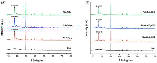 X-ray diffraction patterns in PLA films with (A) pure nanoparticles and (B) nanoparticles modified with CEO.
