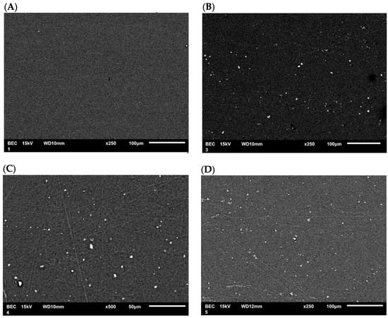 SEM micrographs of the films modified with CEO were obtained to observe the surface morphology of the PLA films and examine the distribution of the nanoparticles. The SEM micrograph (Figure 11A) of pure PLA shows a smooth film, indicating that the polymer was uniformly dissolved in the solvent. The SEM micrograph (Figure 11B) of the PLA film containing TiO2-CEO depicts the distribution of nanoparticles within the polymer network. The PLA film containing CaCO3-CEO exhibits a similar distribution of nanoparticles, as shown in Figure 11C. Also, the PLA film containing Al2O3-CEO displays nanoparticles distributed throughout the film, as illustrated in Figure 11D. Some small agglomerations can be observed due to static charges generated during the interaction of nanoparticles. However, most of the nanoparticles show a uniform distribution. Additionally, some line marks are visible on the films, likely resulting from the drying process in Petri dishes, which left their marks on the films. However, no scratches or ruptures are observed, indicating that the films were manufactured appropriately.