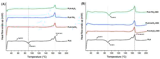 In Figure 9B, we observe the spectra of PLA with nanoparticles loaded with CEO. The bands described for pure PLA remain and there are no observable modifications among them. However, the intensity of the bands slightly decreases. As mentioned earlier, this effect may be due to low polarity. Thus, adding these nanoparticles modified with CEO does not affect the molecular structure of pure PLA. Famil et al. [56] examined a similar behavior in their PLA films with added SiO2 particles at different concentrations (1%, 3%, and 5%). When evaluating the FTIR spectrum, they found no changes in the molecular structure of PLA. Similarly, Heydari-Majd et al. [57] developed PLA composites with ZnO nanoparticles and essential oils of Zataria multiflora and Mentha piperita. They concluded that ZnO reinforcement did not modify any peak in PLA, except for a considerable reduction in the intensity of the peak at 3450 cm−1. In contrast, composites containing essential oils slightly decreased the intensity of the peaks. Qin et al. [58] reported that the addition of essential oils (tea tree, bergamot, lemongrass, rosemary, and clove) to the PLA matrix only caused changes in the intensity of the peaks, and it did not modify the molecular structure but did alter the intermolecular interactions.
