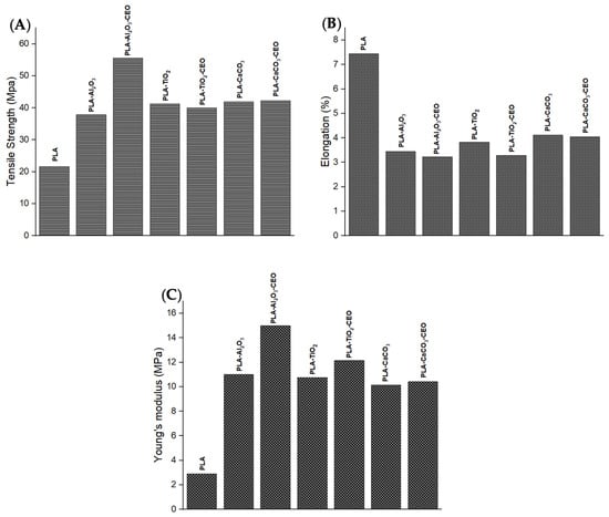 Tensile strength measures the resistance of a material to breaking when subjected to a force. Pure PLA films exhibited lower tensile strength (21 MPa) than films containing nanoparticles, as shown in Figure 14A. Thus, the PLA films with nanoparticles are stronger, increasing their tensile strength by around 50% compared to pure PLA films. The PLA film containing Al2O3 nanoparticles modified with CEO has the highest tensile strength. This could be attributed to good interaction between the nanoparticles and the PLA polymer matrix, increasing intermolecular forces between the chains.