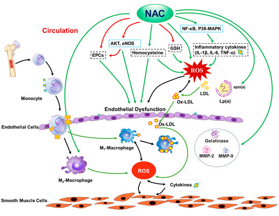 Due to the complex nature of atherosclerosis pathogenesis, the mechanisms for the effects of NAC on atherosclerosis are also complex, including (but not limited to) (1) modifications of lipid metabolism, (2) inhibition of the expressions of gelatinase, MMP-2, and MMP-9, (3) blocking the in vivo biotransformation of native LDL to ox-LDL, and directly suppressing ROS production from ox-LDL, (4) increasing intracellular glutathione levels, and thus protecting endothelial function, (5) attenuation of NF-κB and p38-MAPK signaling, thus decreasing inflammatory cytokine production, (6) the preservation of circulating endothelial cell progenitor cells, (7) reduction of homocysteine levels, (8) attenuation of endothelial senescence and damage, while enhancing endothelial function through multiple mechanisms, including activation of Akt signaling and eNOS, and (9) the preservation of M2 polarization in the hyperlipidemic condition, thus reducing inflammation and oxidative stress, as shown in Figure 1.