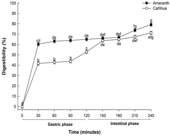 Mean percentage of digestibility (±standard error) of amaranth (A. cruentus) and cañihua (Ch. pallidicaule) proteins over time obtained with two-way ANOVA (Supplementary Material, Table S1). The letters indicate the multiple comparisons between the orthogonal contrast method food matrix and time for α of 0.05.