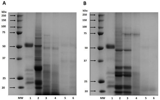 The A. cruentus species of amaranth has reported globulins at 20–43 kDa [45]. The acid subunits of globulin 11S were identified at 29.3 and 32 kDa, while the basic subunits were found at 20.8 kDa [14]. Additionally, a globulin-type protein with a molecular weight of 64.5 kDa was identified in amaranth proteins of the A. cruentus species [43]. The glutelin and prolamine fractions constitute approximately 25–30% and 2–3% of the amaranth proteins, respectively, and their molecular weights have been identified as 67–43 kDa and 110–200 kDa, respectively [45,46]. Gastrointestinal digestion resulted in a decrease in band intensity with longer digestion times since, after 120 min of digestion with pepsin (Figure 2A, lane 4), fainter bands were observed between 48 and 75 kDa. However, no intense bands were observed after intestinal digestion with pancreatin for 60 and 120 min (Figure 2A, lanes 5 and 6), indicating the hydrolysis of proteins into peptides of lower weight and amino acids.