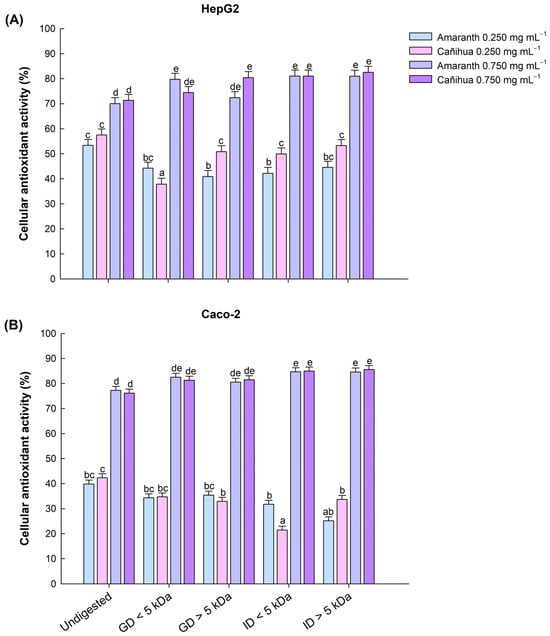 Effect of gastric and intestinal digests of amaranth and cañihua proteins with molecular weight < 5 kDa and >5 kDa on antioxidant activity (%) in human hepatocellular carcinoma cells (HepG2) (A) and human colorectal adenocarcinoma cells (Caco-2) (B). Comparison between protein concentrate without digestion (Undigested), gastric digestion fractions < 5 kDa (GD < 5 kDa), gastric digestion fractions > 5 kDa (GD > 5 kDa), intestinal digestion fractions < 5 kDa (ID < 5 kDa), and intestinal digestion fractions > 5 kDa (ID > 5 kDa). The mean values (±standard error) obtained from three-way ANOVA (Supplementary Material, Table S4) are shown, and the letters on the bars indicate the post hoc for α of 0.05 between the digests at the different protein concentrations.