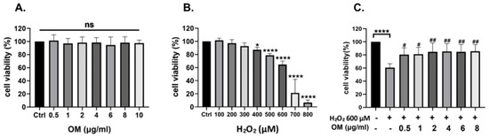 To evaluate the cytoprotective effect of OM, firstly, the cells were pretreated with multiple concentrations of OM (0.5–8 μg/mL) in serum-free culture media for 24 h and then treated with 600 μM H2O2 in serum-free culture media. Thereafter, cell viability was evaluated by culturing with MTT solution for 2 h. Cell viability was measured using SpectraMax ABS Plus (Molecular Devices, Thermo Fisher Scientific) at 570 mm wavelength. The experiment was conducted in serum-free culture media, including the control group.