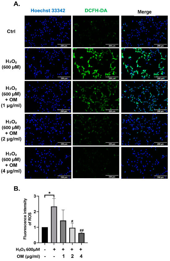 We evaluated the effect of OM on oxidative stress-induced ROS generation and accumulation. We found that ROS significantly increased with H2O2 treatment, but ROS decreased in a dose-dependent manner in the OM pretreatment group (Figure 2A,B). This result suggest that OM can alleviate ROS generation and accumulation caused by oxidative stress.