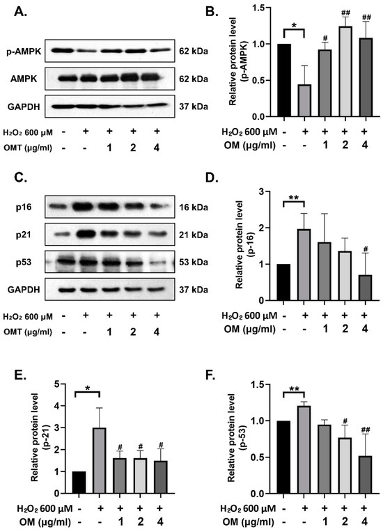 We assessed whether OM treatment restores the activity of AMPK and reduces senescence in a H2O2-induced senescent cell model. In the oxidative stress-induced group (H2O2 600 μΜ), AMPK activity was significantly decreased, while AMPK activity was significantly recovered in a dose-dependent manner (Figure 3A,B). We evaluated the anti-senescence effect of OM through the expression of senescence markers p53, p21, and p16. The expression of senescence markers increased in the H2O2 group, while it was observed to be significantly decreased in the OM-treated group (Figure 3C–F). This result suggests that the activation of APMK by OM reduces oxidative stress and thus lowers the senescence caused by oxidative stress.