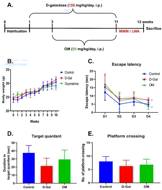 Oxymatrine improves memory loss in D-Gal-induced senescence mice. (A) Schematic diagram showing the experimental plan. (B) Body weights of the mice. (C–E) Behavioral test (Morris water maze test). Each result represents the platform discovery time, dwell time, and crossing result in the target quadrant. (C) On the fourth day, the discovery time of the control and OM groups was shorter than that of the D-gal group. (D) Platform dwell time was lengthened by OM administration. (E) The number of crossings slightly increased. All data are represented as the mean ± standard deviation (SD) (n = 4). * p < 0.05.