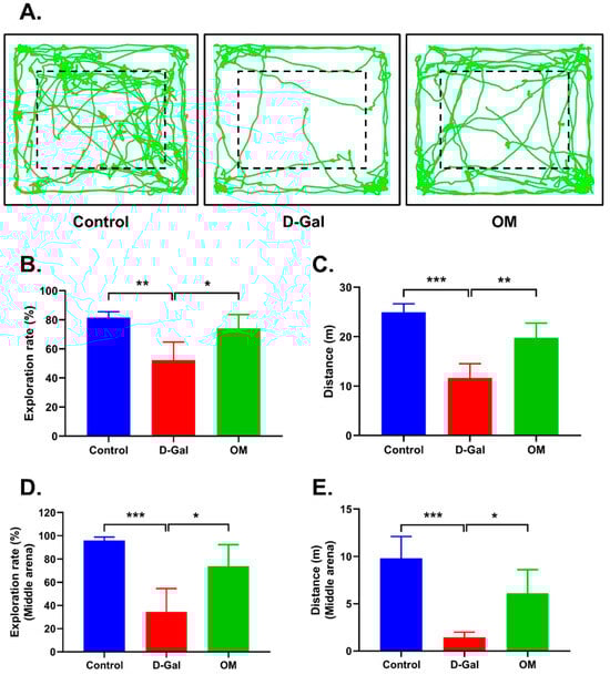 Next, we conducted a locomotor activity open field test to observe activity levels, exploration intention, and anxiety symptoms. Figure 5A shows the overall movement of the three groups of mice. We observed a significant decrease in the exploration rate and total distance travelled in the D-Gal group. Meanwhile in the mice treated with OM, we observed a significant increase. (Figure 5B,C). When a mouse is anxious, it becomes less mobile and tends to stay near the walls in the field. To evaluate this phenomenon, we measured the exploration rate and distance from the center of the field. In the D-gal group, we observed a significant decrease in the exploration rate and distance from the center, and the mice stayed at a specific area. On the other hand, we observed increased movement in the OM group (Figure 5D,E). This result suggests that OM participates in neurological recovery and reduces anxiety symptoms.