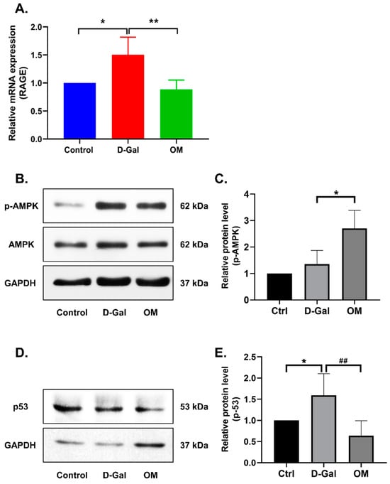 The long-term administration of D-Gal can cause neuroinflammation, which can cause problems with cognitive function. This can be associated with signs of brain aging. We evaluated the expression of RAGE (a senescence-related inflammatory marker) at the mRNA level to investigate whether OM administration could reduce hippocampal inflammation. We found an increase in the expression of RAGE in the D-Gal group when compared to the control group, whereas it was significantly decreased in the OM group (Figure 6A). This suggests that OM administration can reduce the expression of RAGE and alleviate hippocampal inflammation. Additionally, in the D-Gal-induced senescence mouse model, we evaluated the anti-senescent effects of OM in the hippocampal tissue. AMPK activity between the D-Gal group and control group did not show any significant changes, but when comparing the D-gal group and the OM group, the AMPK activation in the OM group was significantly increased (Figure 6B,C). Furthermore, we assessed the senescence marker p53. It was also decreased in the OM group (Figure 6D,E). These results suggest that OM could ameliorate senescence through reducing oxidative stress by restoring AMPK activity from the hippocampus.
