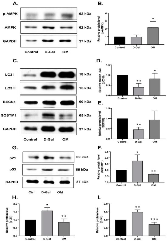 Finally, we investigated the heart tissues obtained from the D-Gal-induced senescence mice treated with OM. AMPK activity in the D-Gal group did not show any significant changes when compared with the control, but we did observe a significant increase in activity upon OM treatment (Figure 7A,B). Furthermore, we found a deterioration of autophagy activity in heart tissue in the D-Gal group, whereas OM administration increased the expression of autophagy markers (Figure 7C–F). Further, we evaluated the senescence markers p53 and p21 in heart tissue. The expression of senescence markers was found to be decreased (Figure 7G–I). This result suggests that OM could restore AMPK activity in cardiac tissues to help autophagy activation and reduce senescence.