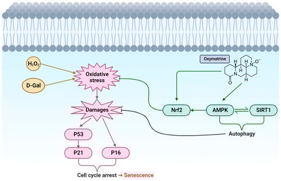 Overall schematic representation of how Oxymatrine responds to oxidative stress and senescence. Oxymatrine causes the activation of AMPK. AMPK activates the antioxidant pathway. Additionally, AMPK interacts with SIRT1 to mediate autophagy. Reduced oxidative stress and cell damage prevents senescence.