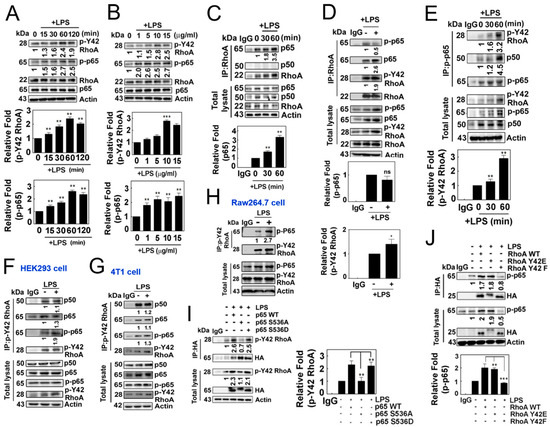 Next, we observed that LPS induced an increase in p-Tyr42 RhoA as well as p-p65 in a concentration- and time-dependent manner (Figure 2A,B). Notably, we also observed that RhoA co-immunoprecipitated with p65/RelA in response to LPS, but not with p50 (Figure 2C), while LPS did not promote the co-immunoprecipitation of RhoA with p-Ser 536 p65 (Figure 2D). In contrast, p-Ser536 p65 particularly co-immunoprecipitated with p-Tyr42 RhoA along with p50 (Figure 2E). Furthermore, p-Tyr42 RhoA co-immunoprecipitated with p-Ser536 p65, and vice versa, in HEK293, RAW264.7 and 4T1 cells, suggesting that the interaction between p-Tyr42 RhoA and p-p65 may be a prevalent phenomenon in several cell types (Figure 2F–H). Of note, p-Tyr42 RhoA co-immunoprecipitated with p50 even without LPS stimulation (Figure 2F,G). Next, we attempted to clarify whether the phosphorylation of RhoA and p65 is crucial for their protein interactions. The p65 S536A mutant, which mimics the dephosphorylated form, could not co-immunoprecipitate with p-Tyr42 RhoA, while p65 WT and p65 S536D, mimicking the phosphorylated form, readily co-immunoprecipitated with p-Tyr42 RhoA, demonstrating that the p-Ser536 residue of p65 is essential for its interaction with p-Tyr42 RhoA (Figure 2I). Moreover, RhoA Y42F did not co-immunoprecipitate with p-p65, while RhoA WT and RhoA Y42E, mimicking the phosphorylated form, co-immunoprecipitated with p-p65, suggesting that the p-Tyr42 residue of RhoA is critical for its interaction with p-p65 protein (Figure 2J).