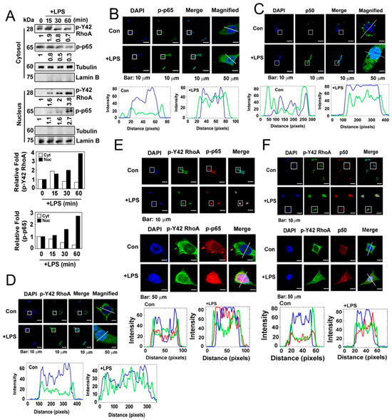 (A) HEK293T cells were cultured in a serum-depleted media for 8 h and stimulated with (10 μg/mL) LPS in a time-dependent manner. Nuclear and cytosolic proteins were separated by a fraction assay, and the levels of the target proteins were measured by Western blot analysis. Lamin B and tubulin served as markers for the nuclear and cytosolic fractions. (B) HEK293T cells were cultured without serum for 8 h and then treated with LPS (10 µg/mL) for 1 h. Immunofluorescence staining was used to assess the localization of p-p65 (green) and the nucleus (blue). (C) Immunofluorescence staining was used to assess the localization of p50 (green) and the nucleus (blue). (D) Immunofluorescence staining was used to assess the localization of p-Y42 RhoA (green) and the nucleus (blue). (E,F) Co-localization was examined by immunostaining with both p-Y42 RhoA (red) and p-p65 or p50 (green), with DAPI used for staining the nucleus (blue). Representative images of the co-localization of p-Y42 RhoA and p-p65 (E) and of p-Y42 RhoA and p50 (F) are shown. Magnified panels of images of single cells are also shown in both cases. The white lines intersecting the cells serve as indicators for measuring the intensity of fluorescence.