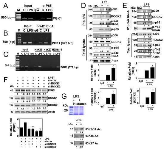 ChIP-PCR using p-p65 antibodies and primers targeting the PGK1 promoter revealed that p-p65/RelA was associated with the PGK1 promoter (Figure 5A). Furthermore, ChIP-PCR with p-Tyr42 RhoA antibodies and PGK1 promoter-specific primers demonstrated the association of p-Tyr42 RhoA with the PGK1 promoter (Figure 5B). Additionally, ChIP-PCR using Ac-H3K18, Ac-H3K27 and Ac-H3K9/14 antibodies and PGK1 promoter-specific primers indicated the presence of Ac-H3K18 and Ac-H3K9/14 on the PGK1 promoter (Figure 5C). Notably, p-p65 and p-Tyr42 RhoA were found to co-immunoprecipitate with p300 histone acetyltransferase (HAT) and ROCK2 (Figure 5D,E). Knockdown of ROCK1/ROCK2 using siRNAs resulted in reduced expression of PGK1 (Figure 5F). These findings suggest that p-p65 and p-Tyr42 RhoA are associated with the PGK1 promoter, recruiting p300 HAT and ROCK2 to facilitate the acetylation of histone on the PGK1 promoter, ultimately leading to the expression of PGK1. Therefore, we have provided evidence that LPS promotes the levels of histone aceylation, including acetylated H3K9/14, H3K18 and H3K27 (Figure 5G).