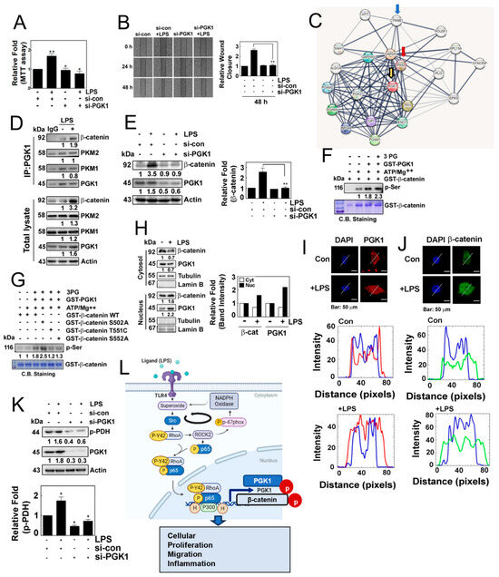 Next, we aimed to investigate the potential role of PGK1 in the inflammatory process. We observed that si-PGK1 significantly inhibited cells’ proliferation and migration in response to LPS (Figure 6A,B). It is worth noting that PGK1 has been shown to associate with pyruvate kinase M (PKM) [19] and β-catenin [20], according to interactome analyses (STRING: functional protein association network: https://string-db.org, accessed on 2 March 2022) (Figure 6C). Building on this result, we examined the protein–protein interactions in response to LPS. PGK1 co-immunoprecipiated with PKM1, PKM2 and β-catenin, concomitantly increasing co-immunoprecipitation with β-catenin (Figure 6D). Remarkably, the knockdown of PGK1 with siRNA markedly reduced the expression of β-catenin, suggesting that the binding of PGK1 with β-catenin may stabilize β-catenin (Figure 6E). As we hypothesized that PGK1 may phosphorylate β-catenin, leading to its stability, we examined the phosphorylation of β-catenin by PGK1. PGK1 enhanced the levels of phosphorylated β-catenin in the presence of ATP/MgCl2 and 3-phosphoglycarate (Figure 6F). At this point, we aimed to identify the specific site of phosphorylation by PGK1on β-catenin. Through an in vitro kinase assay and MALDI-TOF analysis, we identified three candidate phosphorylation sites of β-catenin, including Ser502, Thr551 and Ser552 (Supplemental Figure S1). To confirm which sites of β-catenin were phosphorylated, we generated PGK1 mutants, including S502A, T551C and S552A, and conduced in vitro kinase assay. We found that T551C and S552A mutants attenuated phosphorylation, suggesting that the Thr551 and Ser552 residues of β-catenin may be the phosphorylation sites targeted by PGK1 (Figure 6G). Moreover, LPS induced the translocation of PGK1 and β-catenin to the nucleus, as determined by Western blotting in the separated cytosol and nucleus of HEK293 cells in response to LPS (Figure 6H). Immunohistochemical analyses also revealed the nuclear co-localization of β-catenin and PGK1 (Figure 6I,J). Subsequently, we explored another function of PGK1, and found that si-PGK1 prevented the phosphorylation of PDHA1, suggesting that PGK1 regulates the phosphorylation of PDHA1 in response to LPS (Figure 6K).