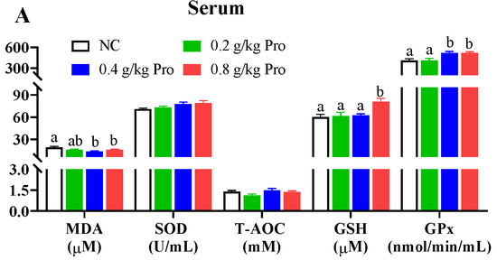Antioxidant capacity was assessed by measuring the levels of MDA, SOD, T-AOC, GSH, and Gpx in different tissues (Figure 1). In the serum (Figure 1A), following Pro treatment, MDA content exhibited a declining trend, with significant reductions observed in the groups supplemented with 0.4 and 0.8 g/kg of Pro compared to the NC group (p < 0.05). Conversely, Gpx activity displayed an increasing trend, and it was significantly enhanced in the 0.4 and 0.8 g/kg Pro-supplemented groups relative to the NC group (p < 0.05). The GSH content also showed an increasing trend and a significant increase was observed in the 0.8 g/kg Pro-supplemented group relative to the NC group (p < 0.05). However, the SOD and T-AOC levels were not impacted by dietary Pro supplementation (p > 0.05).