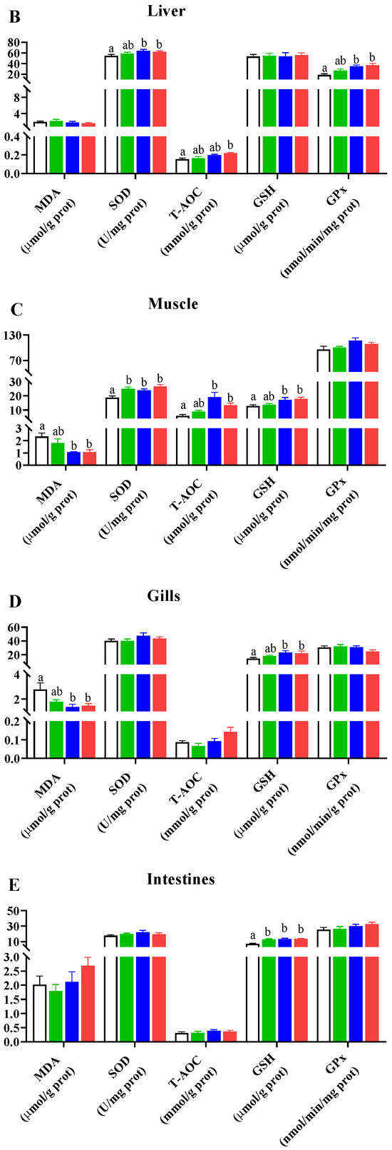 The blood was centrifuged at 5000 r/min for 10 min at 4 °C to obtain the serum. The liver, gill, muscle, and intestine tissues were homogenized with 9 times (w/v) normal saline at 4 °C. In serum, liver, gill, muscle, and intestine tissues, 9 samples from each group were used to detect the antioxidant parameters, including malondialdehyde (MDA), superoxide dismutase (SOD), glutathione peroxidase (Gpx), total antioxidant capacity (T-AOC), and glutathione (GSH). Kits for measuring T-AOC, SOD, and GSH were supplied by Nanjing Jiancheng Bioengineering Institute (Nanjing, China). The Gpx kit was provided from Suzhou Grace Biotechnology Co., Ltd. (Suzhou, China), while the MDA kit was ordered from the Beyotime Institute of Biotechnology (Nantong, China). SOD activity was measured at an absorbance of 450 nm utilizing the WST-1 method, with calculation based on the production of WST-1 formazan. The T-AOC level was assessed using the FRAP assay at 593 nm, which quantifies the reduction of the Fe3+ to the Fe2+ form. The GSH content was assessed based on the intensity of the yellow color produced by its reaction with 5,5′-dithiobis(2-nitrobenzoic acid) (DTNB). The activity of GPx was assayed utilizing cumene hydroperoxide (Cum-OOH) as the substrate, with 5,5′-dithiobis(2-nitrobenzoic acid) (DTNB) serving as the chromogenic agent. The formation of MDA was evaluated using thiobarbituric acid (TBA) as a reactive substrate at 532 nm. The protein content in liver, gill, muscle, and intestine tissues was quantified using the bicinchoninic acid (BCA) assay and the OD value was measured at 562 nm. During the data analysis, the NC (normal control) group served as the control.