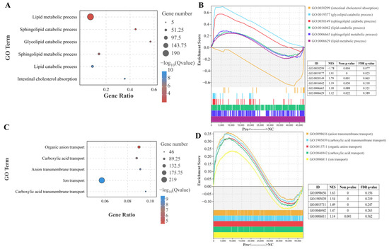 Effects of dietary Pro supplementation on lipid metabolism and ion transport in the intestines of C. carpio. (A) Differential GO terms related to lipid metabolism. (B) GSEA for the GO terms related to lipid metabolism. (C) Differential GO terms related to ion transport. (D) GSEA for the GO terms related to ion transport.