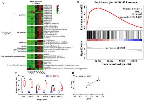 Changes in the lysosome pathway in the intestines of C. carpio between the NC and Pro groups. (A) DEGs in the KEGG lysosome pathway. (B) GSEA for the KEGG lysosome pathway. (C) Key genes expression in the lysosome pathway measure by qPCR, with values expressed as the mean ± SEM (n = 4), * p < 0.05 and ** p < 0.01. (D) Correlation between the qPCR and RNA-seq data.